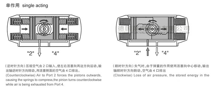 單作用:就是氣缸活塞的一邊是彈簧、一邊是儀表風!@種閥停儀表風時,活塞就會受彈簧力的驅動而使閥門全關或全開。