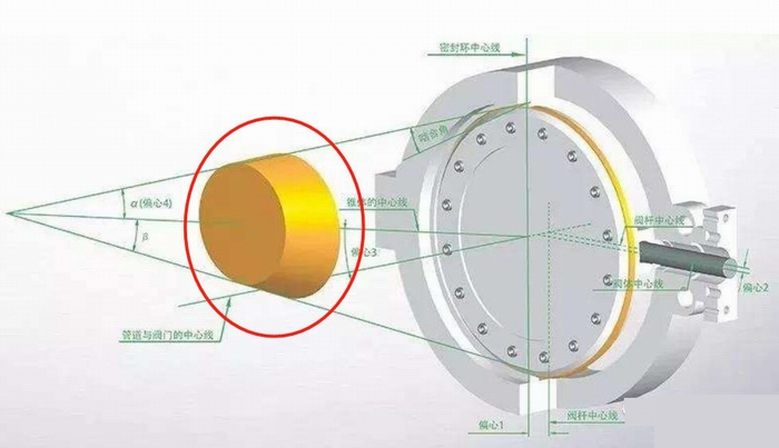 第三道偏心,密封面回轉(zhuǎn)軸線與閥體通道軸線偏心