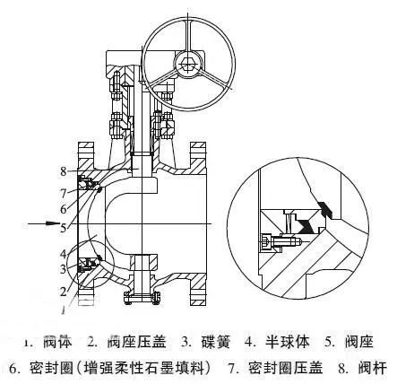 進(jìn)口偏心半球閥密封副的特點(diǎn)是閥門關(guān)閉時(shí),閥座壓蓋壓緊碟簧,由碟簧推動密封壓蓋和閥座向半球體壓緊,并使碟簧在設(shè)計(jì)變形范圍內(nèi),使密封副之間的作用力達(dá)到密封必須比壓,真空技術(shù)網(wǎng)認(rèn)為這樣可以保證閥門在低壓時(shí)不發(fā)生內(nèi)漏現(xiàn)象。在閥門啟閉過程中,閥座、密封壓蓋和密封圈作為一個構(gòu)件隨著半球體開啟角度的變化在管道軸線方向適量懸浮移動,在介質(zhì)壓力作用下向半球體壓緊,其向閥瓣壓緊的作用力隨著介質(zhì)壓力的升高而增大,從而達(dá)到自密封效果。
