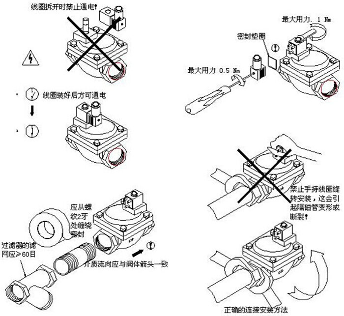 1、進(jìn)口電磁閥安裝電磁閥前,管道必須清洗干凈。建議在閥前安裝過濾器,蒸汽管道安裝疏水閥。