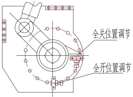 (3)蝶閥全開位置的調(diào)整(出廠時已調(diào)好,如有變動需重調(diào)):調(diào)整方法見圖(2),先將全開位置調(diào)節(jié)螺栓向上調(diào)節(jié),待蝶板全開(即活塞桿全部伸出到位)后再將螺栓向下調(diào)節(jié),頂緊連桿消除機(jī)械連接的間隙,然后緊固螺母即可